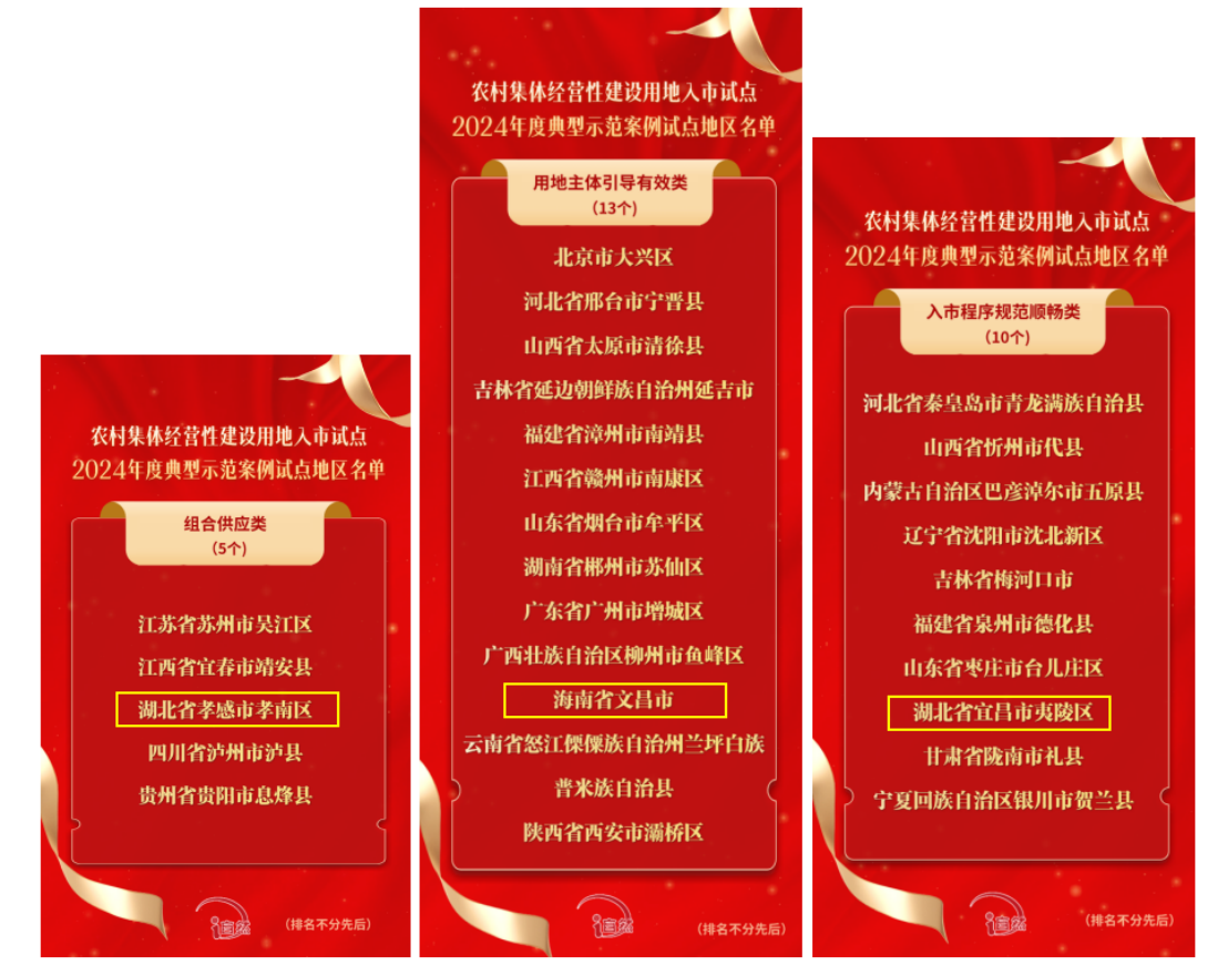近日,自然资源部公布了《农村集体经营性建设用地入市试点2024年度典型示范案例试点地区名单》,全国共有44个试点地区入选典型示范案例,其中,永业行提供技术服务的湖北省孝感市孝南区、海南省文昌市以及参与地价评估的湖北省宜昌市夷陵区深化农村集体经营性建设用地入市试点(以下简称“入市”)项目分别被评为“组合供应类”“用地主体引导有效类”“入市程序规范顺畅类”典型示范案例。