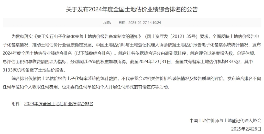 2025年2月26日,中国土地估价师与土地登记代理人协会发布《2024年度全国土地估价业绩综合排名的公告》,在全国4335家备案土地估价机构中,永业行土地房地产资产评估有限公司综合排名湖北第一、全国第五。