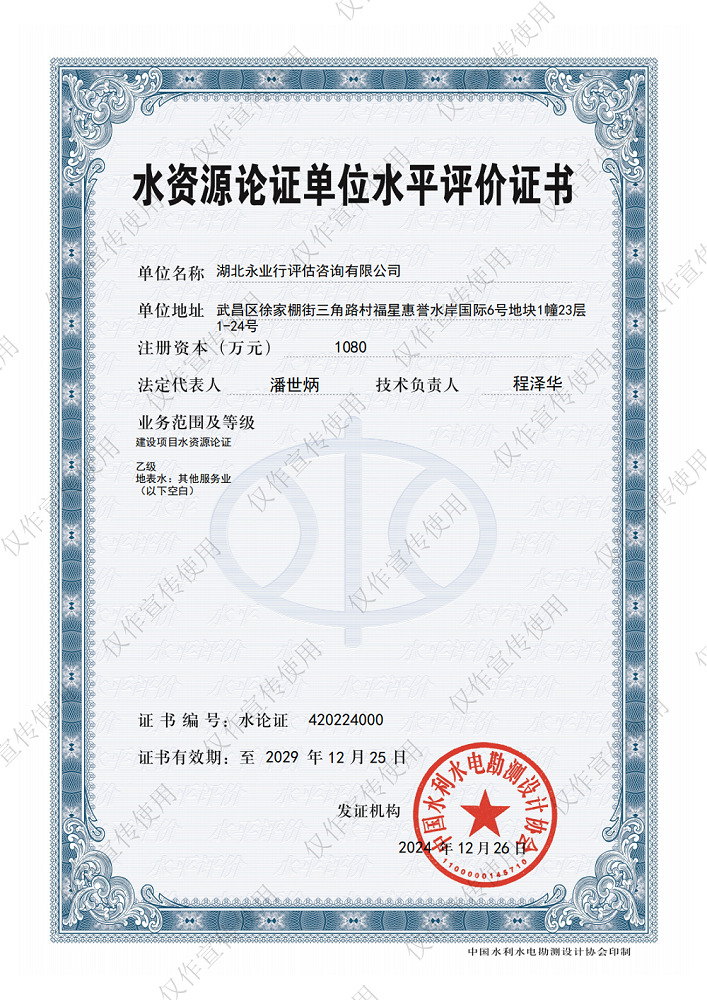 水资源论证单位水平评价证书